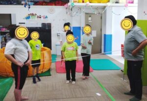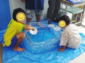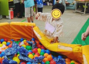 紙風船や、ゴム跳び、おはじきで遊びました♫ みんな、普段はなかなかやることのない遊びに興味津々👀