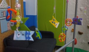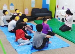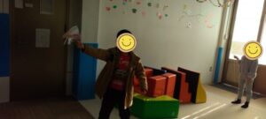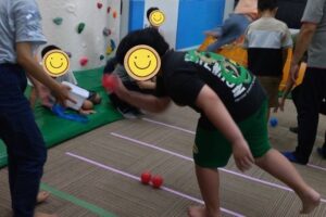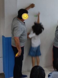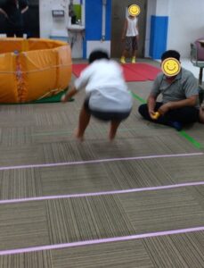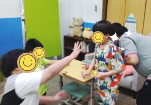 パーテーションの裏でお友達が投げたものを隙間から見て、何か当てるゲームです!