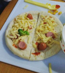 冷凍ピザ生地に、ケチャップや好きな具材をのせていきます❣