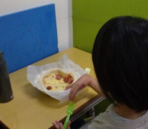 オーブンの前で、ピザが焼ける様子をじっくり見ているお友達もいました😁