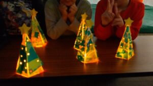 イルミネーション風ツリーの完成! 「きれい〜」と、目をキラキラさせていました!