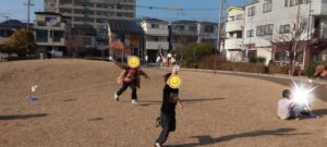 走ると、低空飛行になりながらも、凧は子ども達のうしろをついてくるように(❓)
