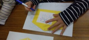 次に家族の似顔絵を描いて、ラミネートします。 ハサミも頑張りました〜✂